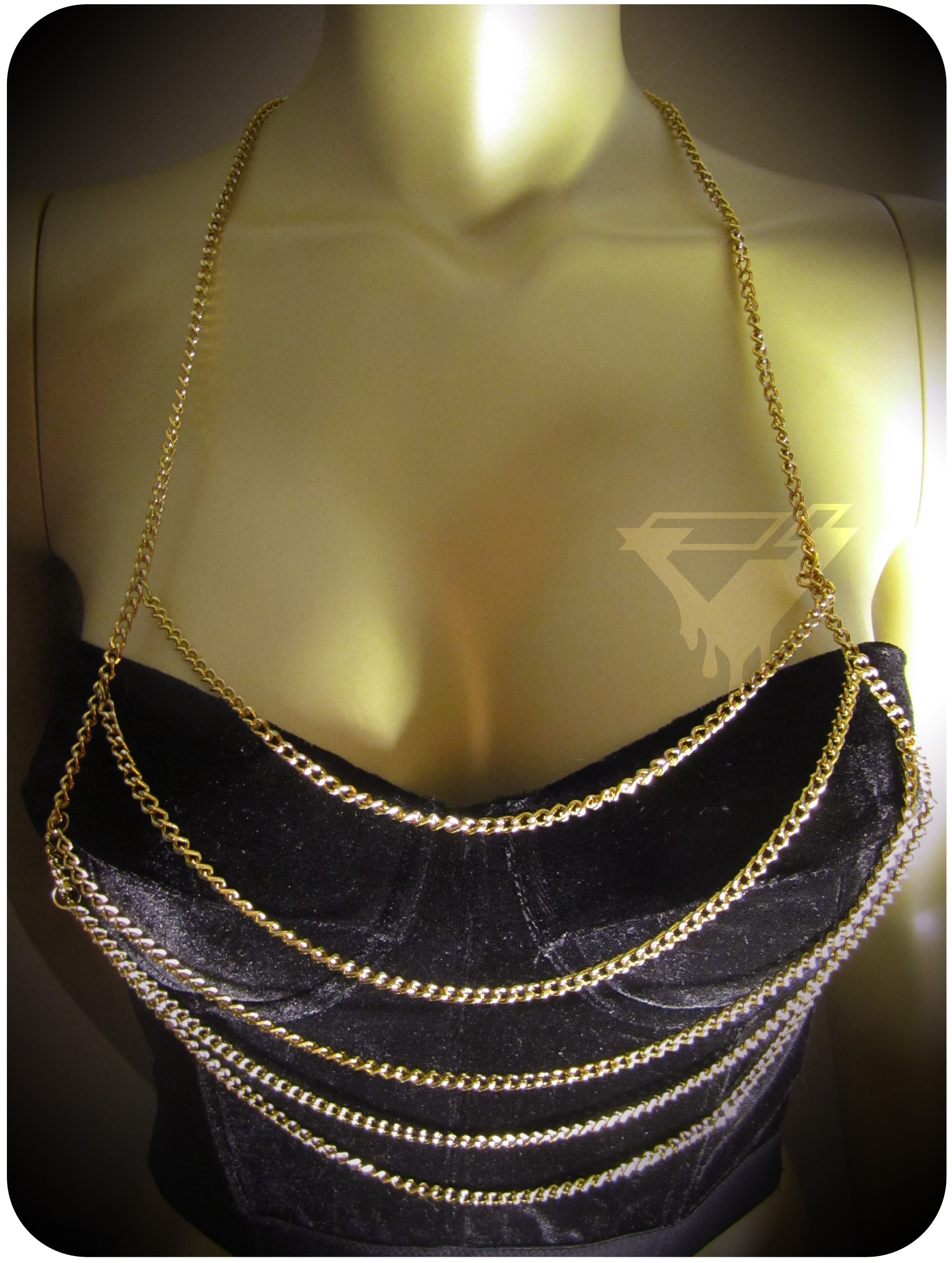 Is the Princess Version not Bold Enough for you? The Queen Chain Vest will definitely cover all your bases! 5 Tiers of Black or Gold Chain detailed with a Silver Diamond Cut Finish to show through the original color hidden beneath. Just enough silver finish to shine when the line hits your vest :). This item wraps around your neck as a regular necklace does, than wraps around your waist to hold into place with a lobster clasp lock.