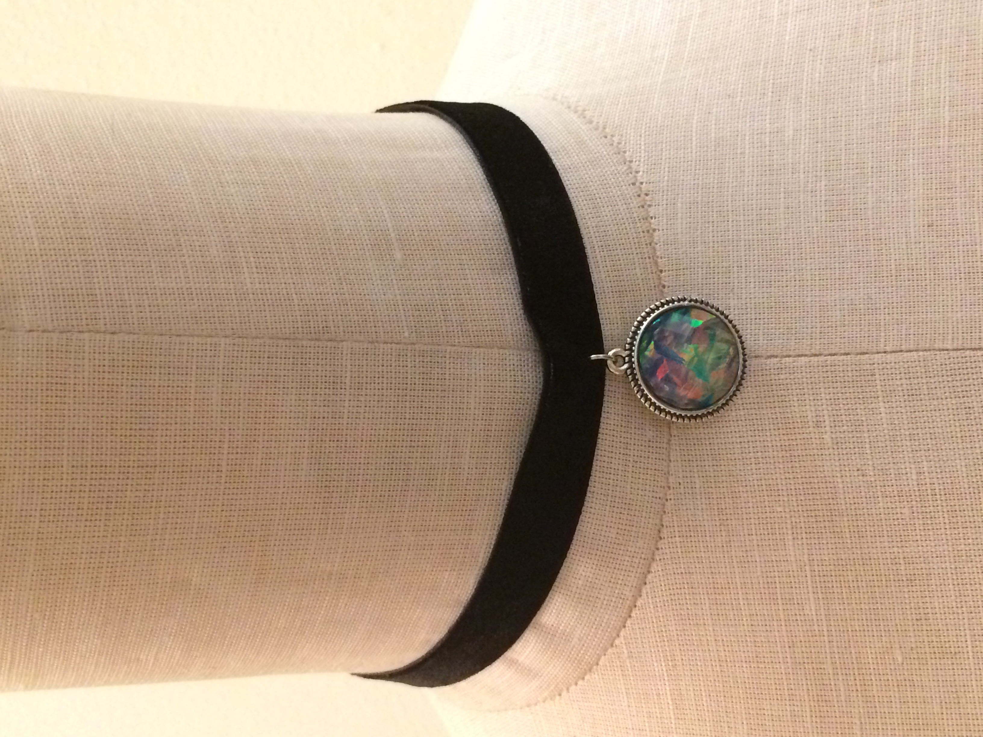 Black Velvet with Silver Hardware and Iridescent faux opal resin stone.