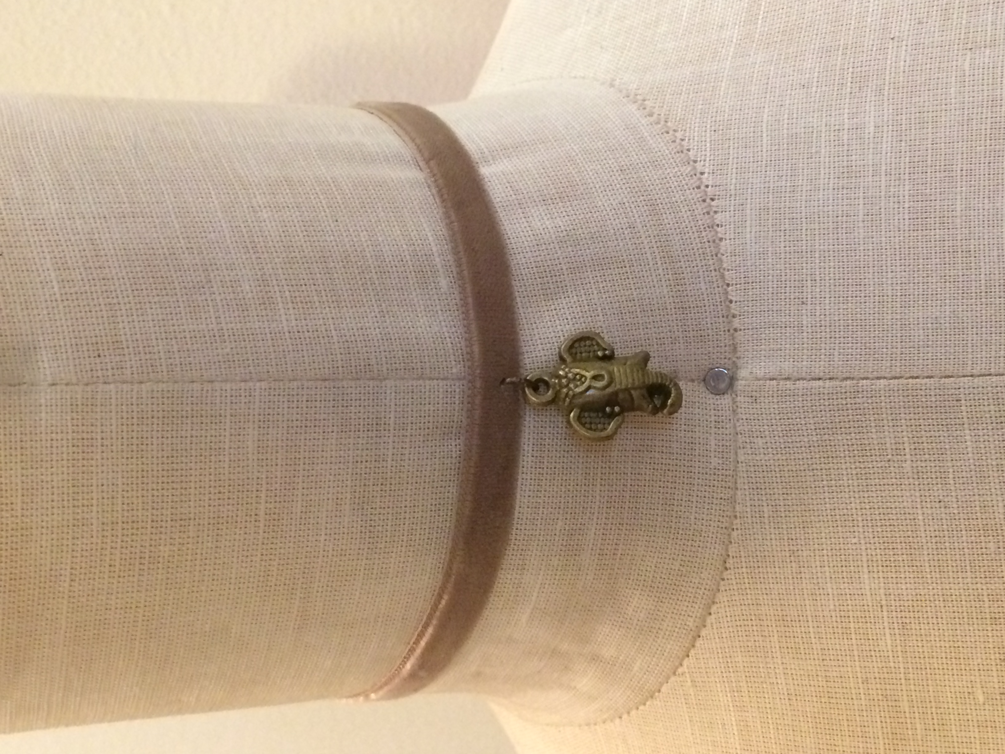 One Size Fits Most. Comes with a 2" Extension to adjust. This Velvet choker doesn't stretch. Beige with Brass Hardware.