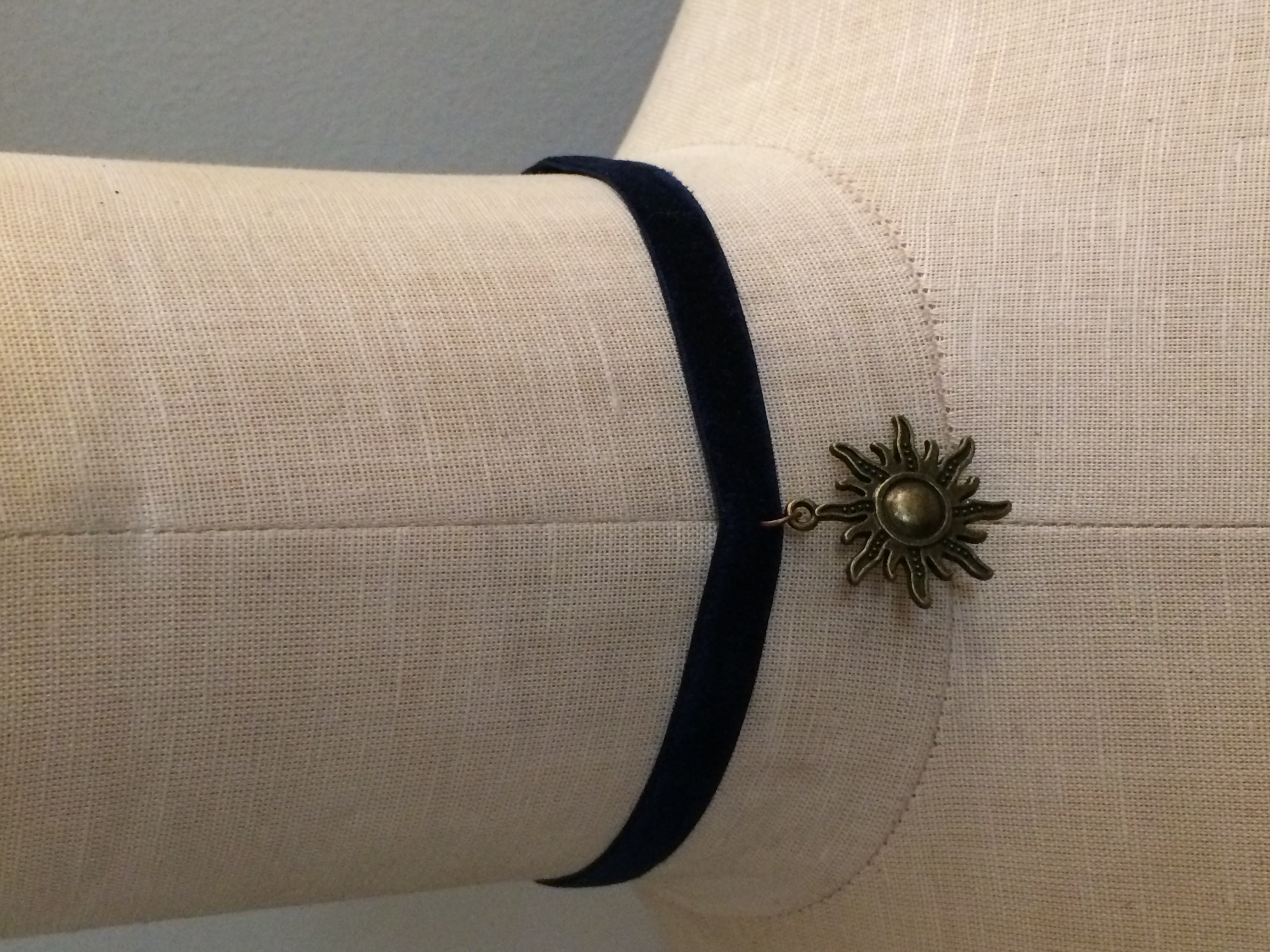 One Size Fits Most. Comes with a 2" Extension to adjust. This Velvet choker doesn't stretch. Deep Navy Blue with Brass Hardware.